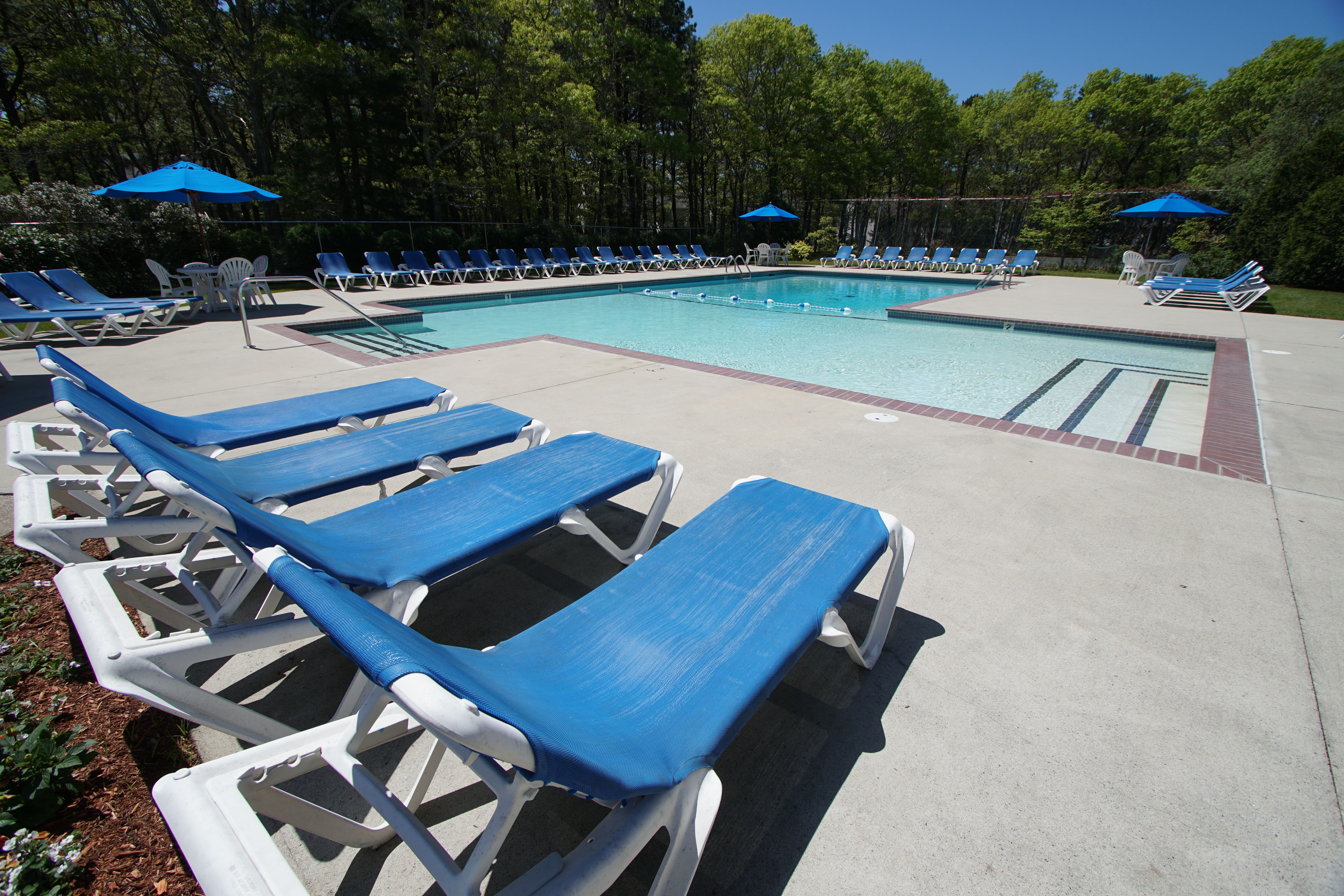 Caption: a large swimming pool with lounge chairs and umbrellas